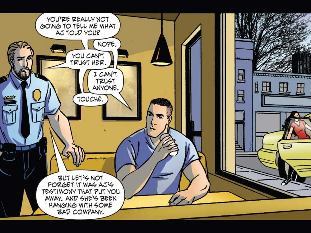 The story starts with WWE Superstar, John Cena, behind bars and charged with a crime he claims he didn’t commit. Cena narrates, “YOU CAN’T SEE ME. THEY HID ME AWAY. TOOK MY BADGE. STOLE A YEAR OF MY LIFE”. Only a panel in we see one of the more clumsy creative choices that Foley employs, shoehorning in catchphrases and wrestling references into every possible opening. And beyond the heavy-handed nature of it, the allusions to the “CEREBRAL ASSASSIN” or “MONEY IN THE BANK” seem at odds with the more serious, film noir inspired tone the comic seems to be going for. Alternatively, Foley could have leaned into the goofiness of the concept of a world of wrestlers, turning chunks of the narration into wrestling style promos and playing to the absurdity of wrestling’s storied history. But the fact that he doesn’t commit fully to the ‘wacky wrestling world’ or to hard-boiled realism (that happens to have wrestlers) makes for a weaker comic overall. However, Foley does write snappy, digestible dialogue that works well when not disrupted by forced references. The characters also have a bland likability about them, again tapping into that film noir aesthetic, but sadly this approach seems to come at the cost of showing any resemblance to their real life personalities. The plot itself is about a missing 10 million dollars with subplots about social protest and Daniel Bryan spray painting ‘YES’ everywhere, but nothing about the narrative seems to be enough to really draw the reader in. The air of mystery is too vague to be interesting and the characters aren’t fleshed out enough to prop up that lack of substance. But more of an issue than anything else is the art, the underlying pencil drawings being below average and the colouring ranging from decent to eyesore. Environments are awash with hideous custard shades of yellow and royal purple with large portions of background left unshaded. At a few high points, the scenes take on a moodier, gothic quality but scenes like these happen far too infrequently and only spotlight the laziness of the other pages.