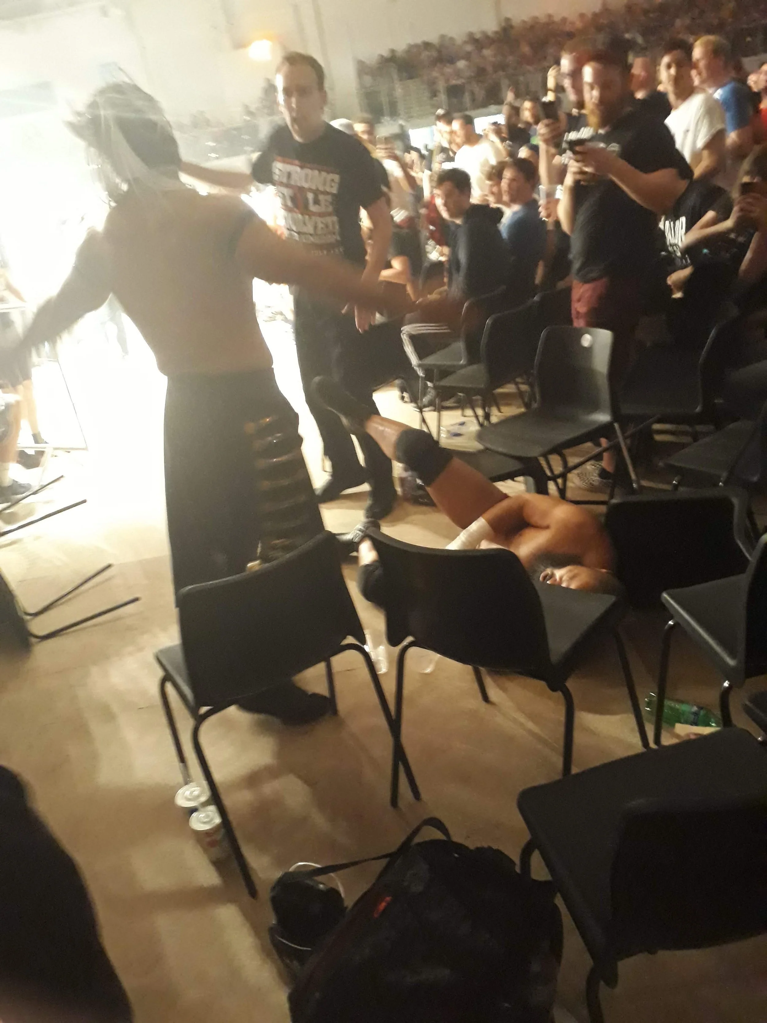 The first half of the show also gave to me probably the most exhilarating experience I’ve ever had at a wrestling show. The theme for the UK tour was a battle for supremacy between two of New Japan’s warring factions, CHAOS and Suzuki-gun. This materialised in the form of a six-man tag with a heated start that came a bit too close for comfort. El Desperado had beaten Gedo towards the barricade just a few rows in front of my seat and decided to see how far into the crowd he could throw him. We all scrambled away to prevent ourselves becoming collateral damage, grabbing our merch and drinks like they were family heirlooms. I imagine it’s what the front lines of the Somme were like. Gedo came flying in, school furniture strewn about the place, Suzuki-gun’s disregard for their opponents matched only by their lack of care for seating plans. Desperado didn’t feel content with this, and full on twatted Gedo with a chair before dragging him back to the ring. After the dust had settled, we pieced together what we could and somehow ended up with extra chairs. My leading theory at the minute is that Gedo hit the chairs so hard they split into two like the broom in Sorcerer’s Apprentice. On top of all that madness, this match also highlighted just how unstable the guard rails were. One thing missing from the usual New Japan shows were the young boys at ringside acting as a security of sorts, whose jobs include keeping the guard rails sturdy whilst someone gets tossed into them. Without them there, all hell broke loose. Jay White hadn’t seemed to register that and after he launched a Suzuki-gun goon into one, sending one flying up a good two feet off the ground, I’m pretty certain I sure him cry; ‘OH SHIT!’